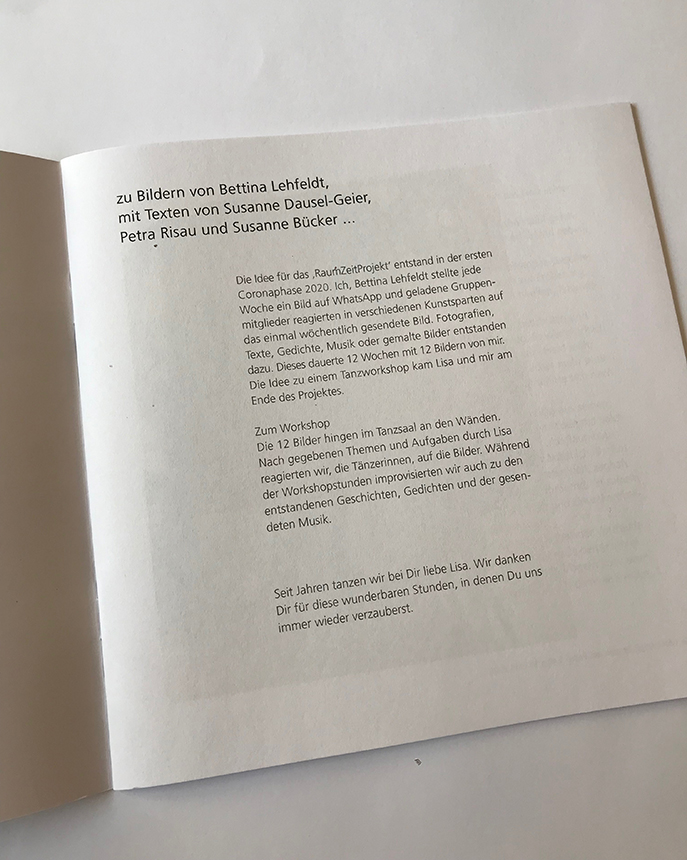 Nach 12 Wochen beendete ich das WhatsApp Projekt. Lisa Bleiker, Tänzerin und ich kamen auf die Idee in einem Workshop tänzerisch auf die Bilder zu reagieren. Dazu ist eine kleine Broschüre über diesen wunderbaren Tanzworkshop mit den Tänzerinnen entstanden.
